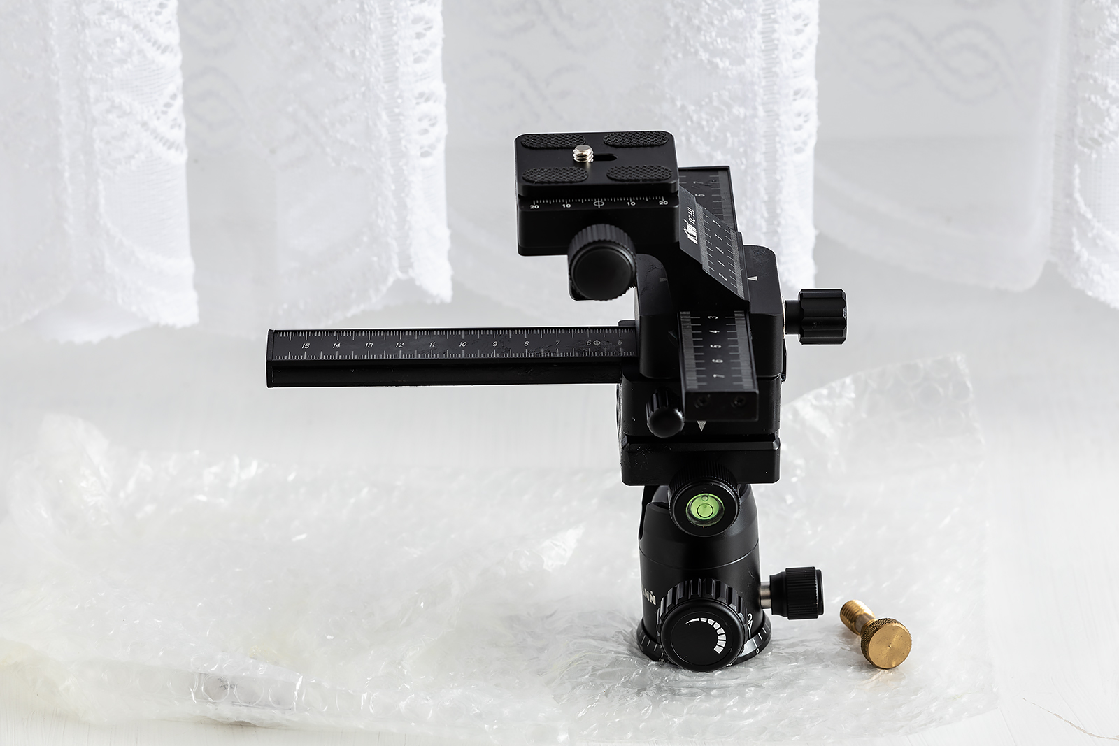 Předmět umístěný na dvoucestnym makroposuvu a kulové hlavě pro natočení a posunutí focené scény do středu CNC mikroposuvu (kde bude mít nejvyšší volnost počítačem řízeného pohybu ve všech směrech).