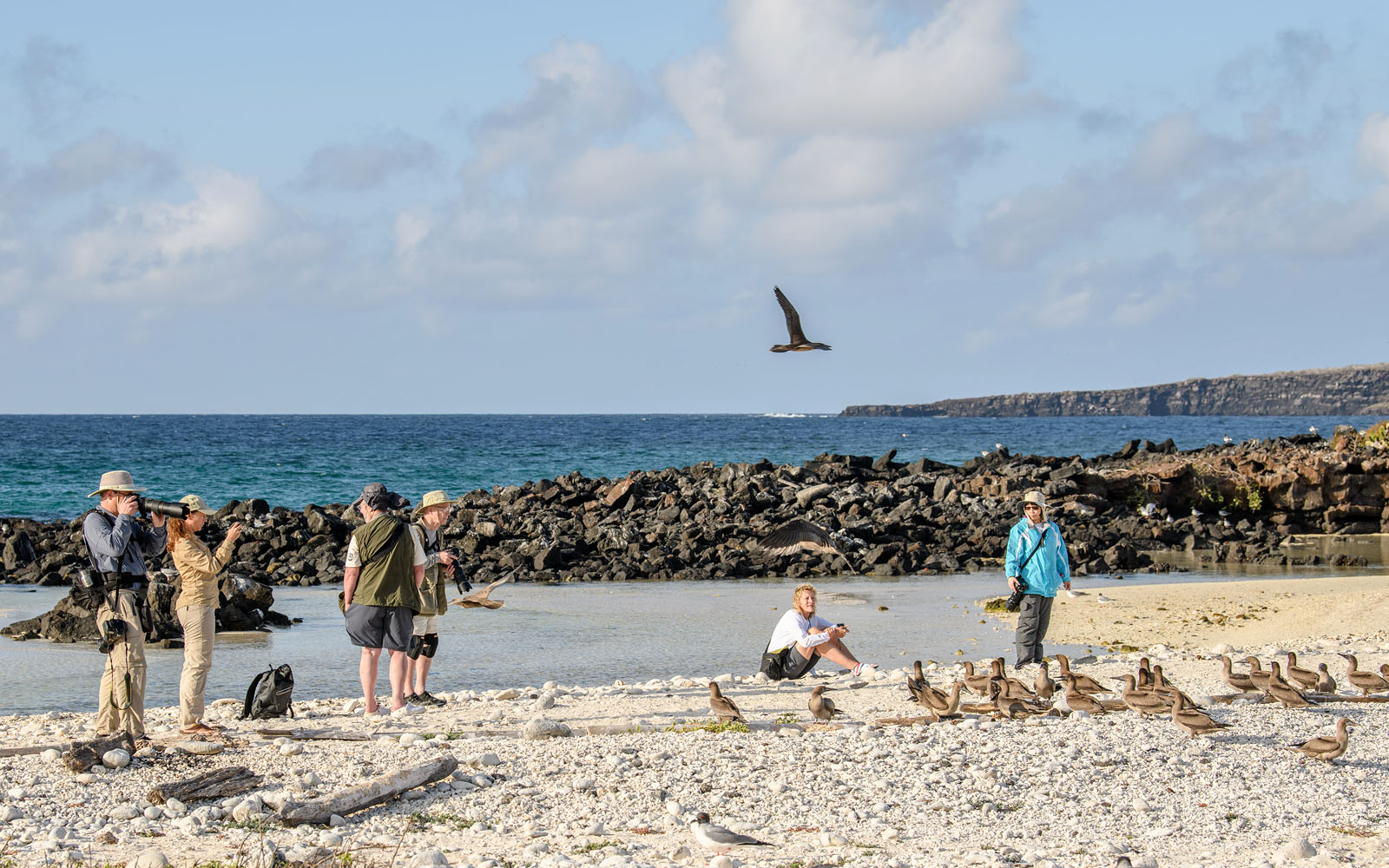 Ještě nějací terejové a fregatky. Nemají se rádi, fregatky terejům kradou ulovené ryby. Dobrou noc nebo už dobrý den :D