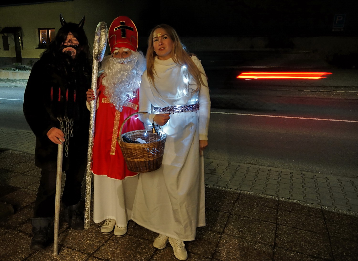 Jinak by certova silueta na velmi temnem pozadi (stali zrovna ve stinu nakladniho auta stojiiho vpravo pred nejblizsi poulicni lampou - proto je ten světlý pružek na konci dlažby těsně u chodníku - to je pružek světa na dlažbě za nimi z již tak mizerného světla staré pouliční lampy) :-(