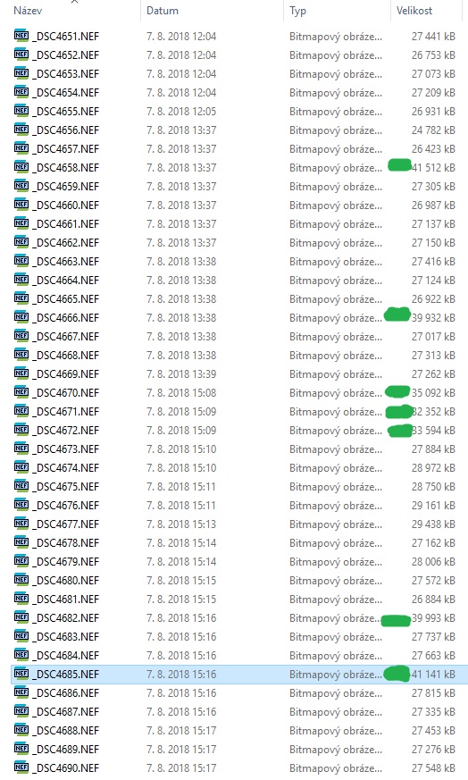 Nikon (NEF)může používat tři způsoby ukládání RAWu. Zcela bez komprese, s bezeztrátovou kompresí a se ztrátovou kompresí. Oba typy komprese jak bezeztrátová, tak i ta ztrátová pak samozřejmě reflektují obsah scény a podle toho ta komprese také vypadá. Tedy je různě veliká. A to jsou ty rozdíly ve velikosti souborů. Pokud bude nastaven formát NEF zcela bez komprese, budou všechny obrázky stejně veliké.