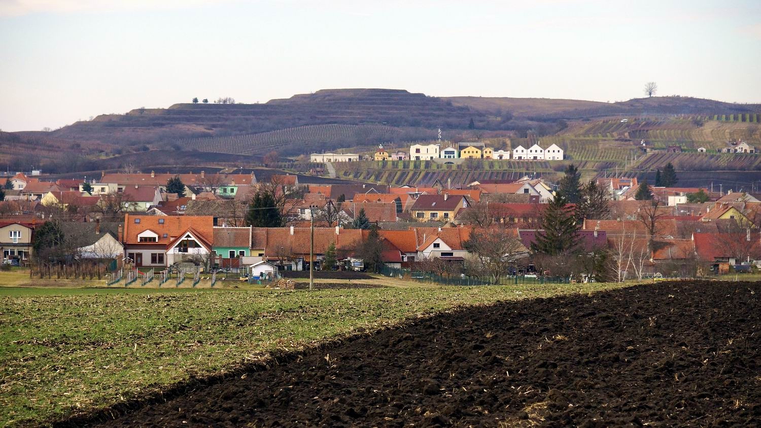 A tedy fotku na to, jak jinak - z cest ze svištícího auta přes čelní sklo... - terasy s vinicemi nad obcí Dolní Dunajovice: