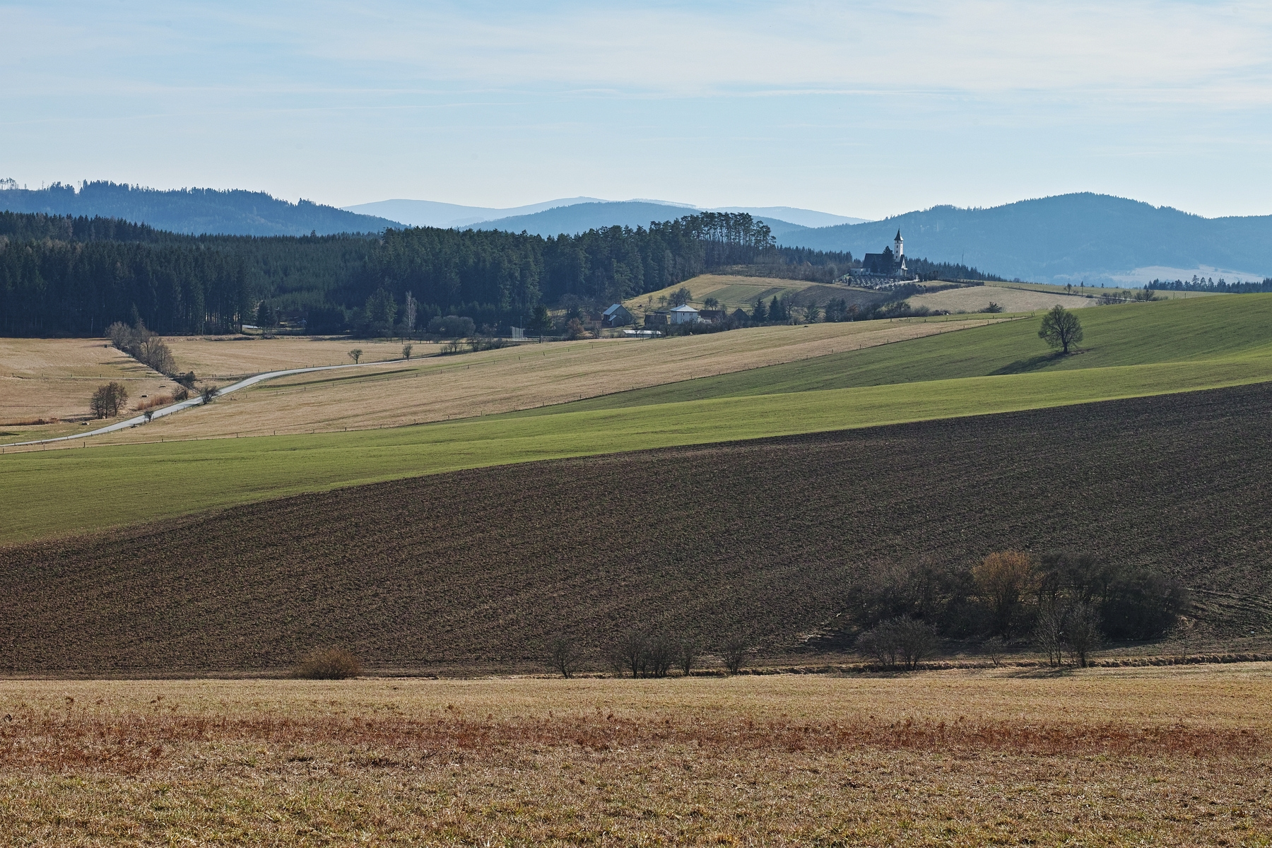 Dám dvě fotky s pohledem na kostel v Lačnově. Foceno v neděli při pátrání po šafránu.