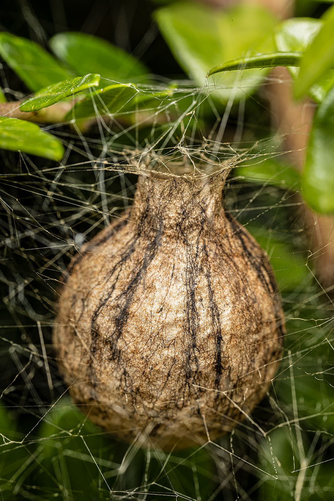 A něco z vlastní zahrádky, doufám kokon (jeden z minimálně tří) křižáka pruhovanyho. Tak snad se můžu těšit na úrodu švestiček.
