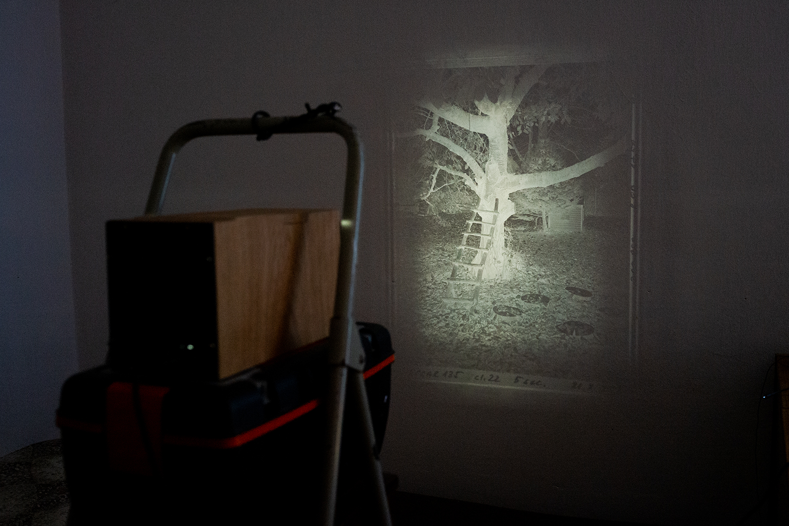 Do spodních pěti lišt se zasouvá negativ. Nejníže je pro "skoro" nekonečno. Horní je pro formát papíru asi 24 x 30 cm. Jemně se zaostří objektivem. Ten nemá tak velký zdvih, abych se obešel bez těch šuplíků. Do horních dvou se zasouvají dva difuzory.