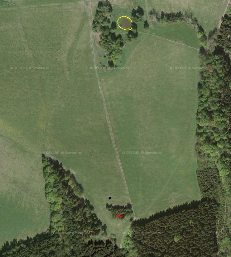 Jaryne: Jo, jo penziony tady nějaké jsou, klidně přijeď na zotavenou. :mrgreen: . Přikládám k upřesnění malinko obsáhlejší mapku. To červené je řopík obklopený houštím (je součástí místní naučné stezky po asi 5 okolních řopících, je jich tu ale mnohem víc) a pod ním je přibližné místo (černý puntík) focení snímku. To šedé (nyní žlutě obkrouženo) je skutečně malé jezírko, uměle vytvořené na mokřině, pro napájení těch ovcí a jiného dobytka.