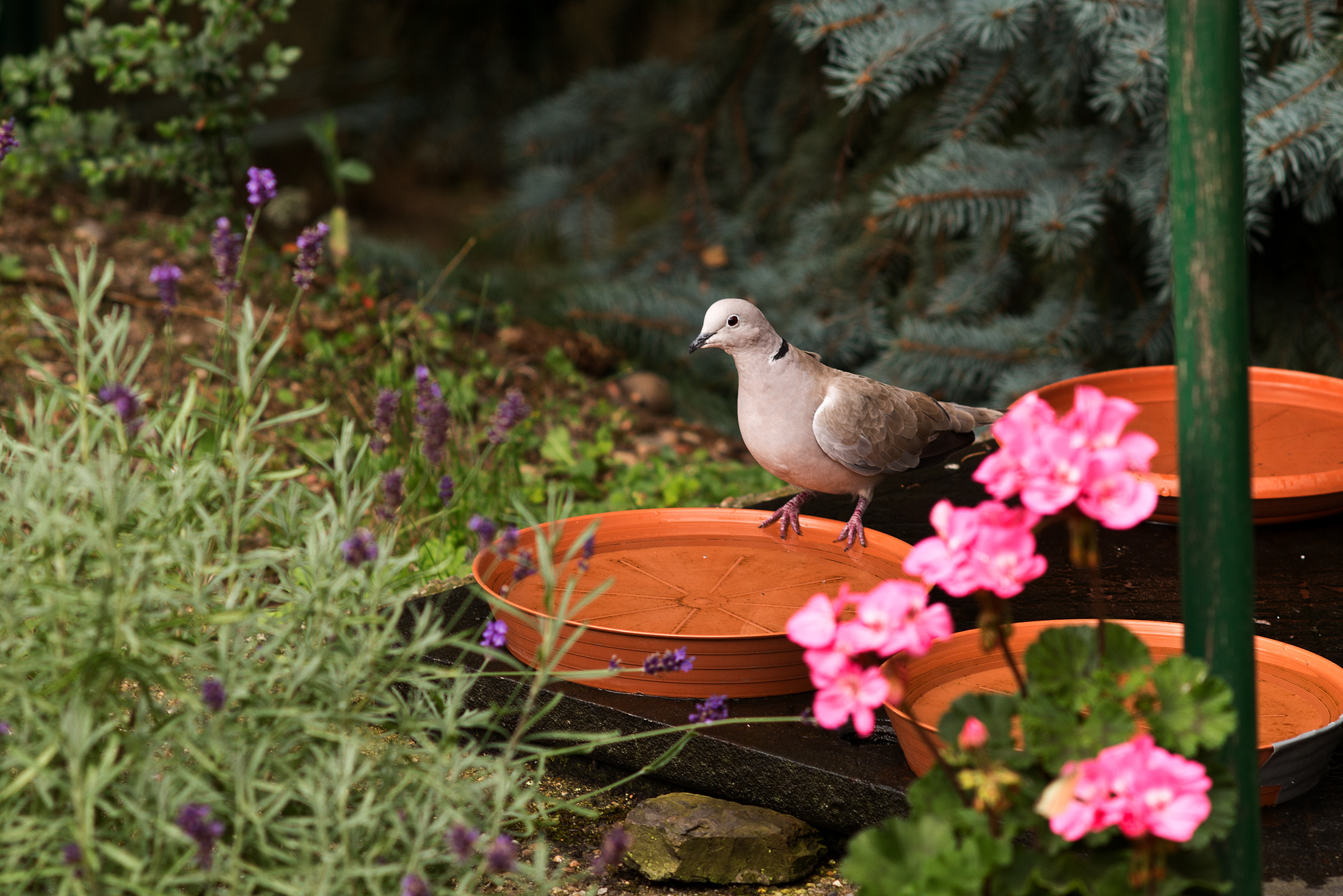 Stálá návštěvnice naši minizahrádky. Už se spolu známe, já jí vždy pozdravím "ahoj hrdličko" a ona jen laškovně přimhouří své očíčko. Jako stálý vodomilec, musím dopřát toto potěšení i ptáčkům. A jak se dokáží v té misce s vodou slastně ráchat! Nejvíce to prožívají kosáci, jenomže jsou to sobečkové a ostatní z tohoto bazénu vyhánějí. Dokonce i své kolegy. Hrdličky se moc nekoupou, většinou se jen napijí a zase odletí. Je hezké je pozorovat a kolikrát je to větší zábava, než se koukat na televizi. A je to i bez koncesních poplatků!!