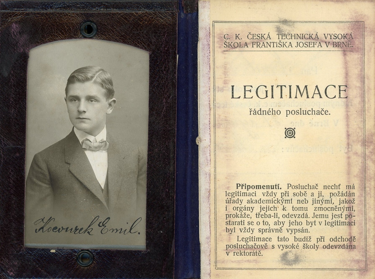 Hejhulák píše:Dostala se mi do ruky docela zajímavá věc - studentský průkaz z roku 1914 pro Technickou vysokou školu Franze Josefa v Brně ve skvěle zachovalém stavu. Uvnitř foto z té doby, tedy více než 100let staré.