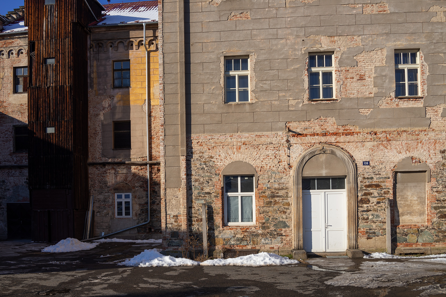 A ještě jeden z vesničky mé. Ta opadaná fasáda je ještě z roku 2002. Tenkrát tady při povodni voda stoupla až do výšky horní hrany dveří.