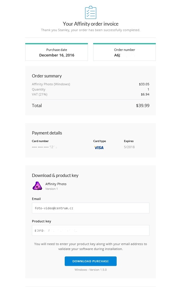 Stanley 900 píše:Tři maily přišly. Poděkování za nákup, Vítejte u Affinity a v třetím mailu Product key.