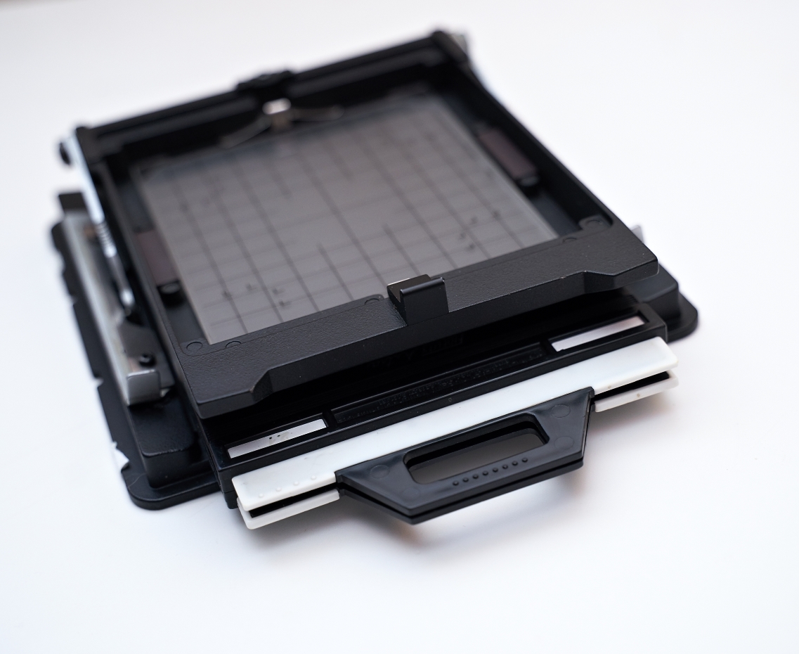 Proto je jednodušší matnici vyndat a kazetu 4x5", nebo 9x12cm přichytit těmi posuvnými držáky na rollkazety.