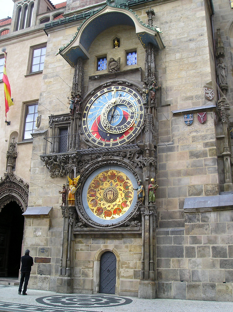 Taky něco z té Stověžaté, ze září.Orloj z divného úhlu a před ním jen jeden člověk a u Židů .V té sinagoze na P9200016.JPG má být na půdě ten Golem,co Rabi Löw, z hlíny ho uplácal,protože měl vzteka na tetu....jak je to v té "strašlivé písni o Golemovi".