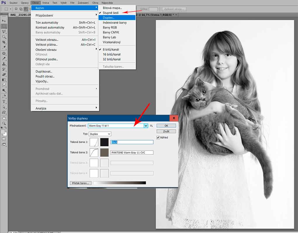 A pokud ti jde o fajnovost tónování, doporučuji následně upravenou černobílou fotku převést Obraz > Stupně šedi a pak se ti otevře možnost duplex, triplex - (tiskařké vychytávky) a vybrat si něco co mě vyhovuje viz. obr.