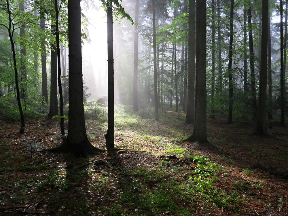 Květnové ráno v lese . Syté zelené barvy,mlha a deroucí se slunce .......Canon G15