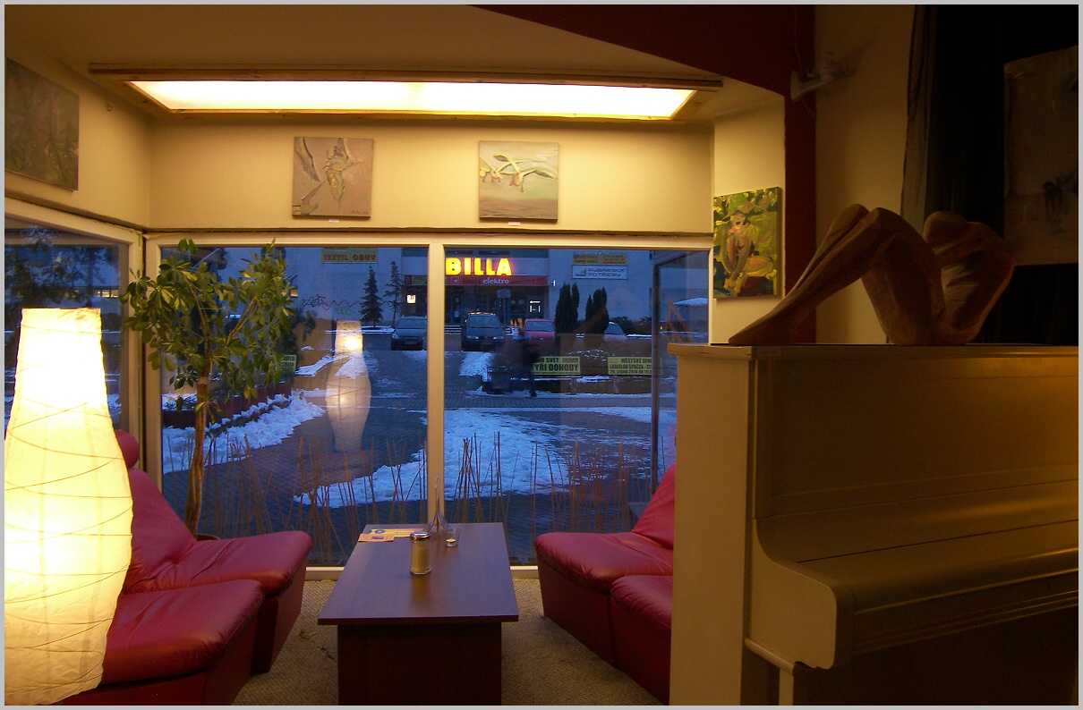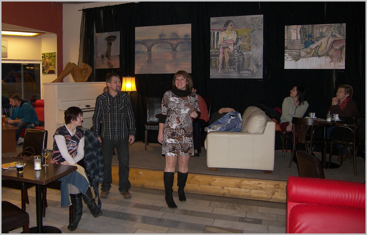 Byli jsme odpoledne s manželkou na další vernisáži obrazů...tentokrát v kavárně. Byla to o dost lepší varianta než výstavní síň....člověk posedí,pokecá u vínečka,požvýká výborné miniřízečky....nic nám tam nechybělo :D (n).