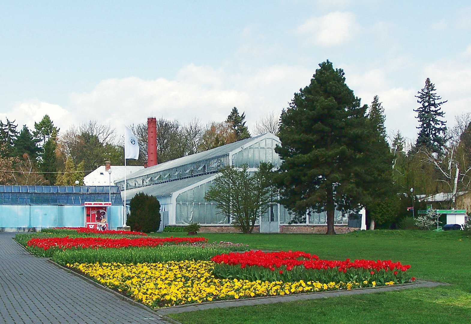 Tulipánová plocha a vzadu je tropický skleník
