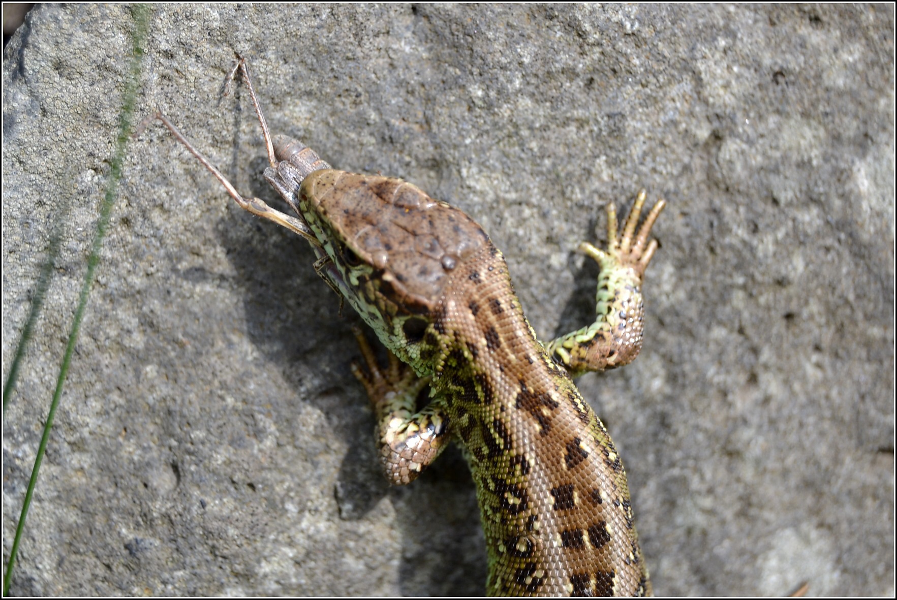 V kamenné podezdívce na chatě se nám zabydlely ještěrky...jsou to ale potvory rychlé, ale podařilo se mi nafotit jak ještěrka šapla lučního koníka a v běhu ho shltla jako malinu....prostě ho do sebe nasoukala ,ani podkovičky nesundala ! :lol: