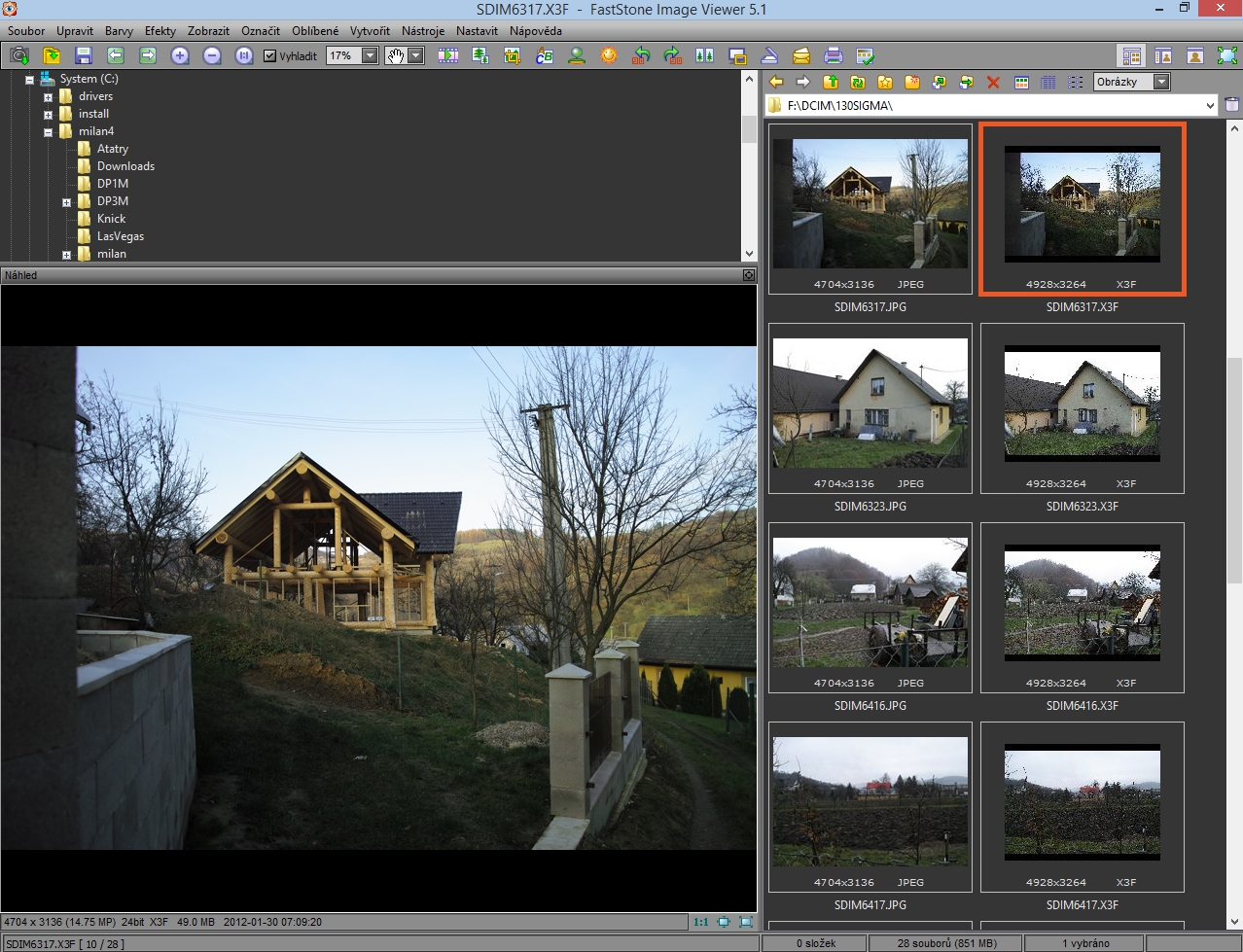Stiahni si Fast Stone Image Viever (je zadarmo, v cestine) dokaze perfektne veci a nahlady fotiek z X3F idu rychle a spolahlivo.
