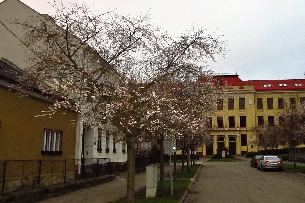 Tady dnes pokračovalo jaro. Před gymplem kvetou sakury a slunce podpaluje paneláky.