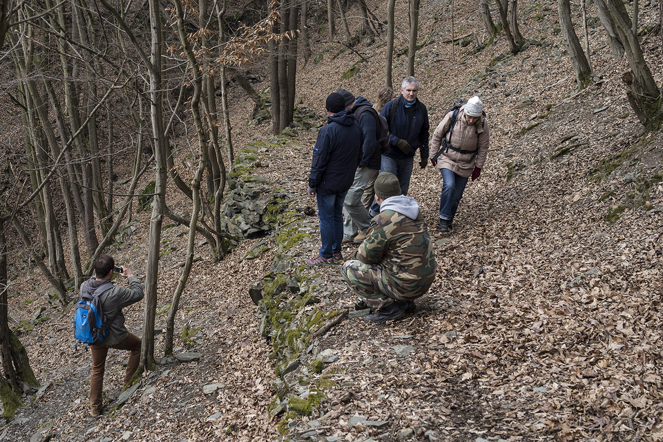 Ahoj, posílám pár fotografií z dnešního "vejšlapu s geologem Víznerem" a dalšími jeho kolegy zlatokopy. Tentokrát je zaujaly zbytky cesty, která by v současnosti postrádala jakýkoliv význam. Její původ není znám, ale je dost možné, že pochází ještě ze středověku. Zachovala se i proto, že tato oblast je špatně přístupná a tudiž moc nenavštěvovaná.
