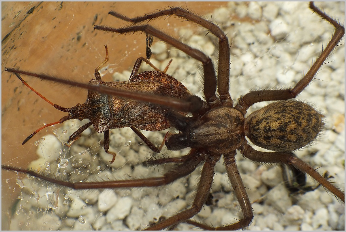Hele kolegáčci.....předem se omlouvám všem ,,útlocitnějším" povahám ,ale dneska jsem krmil tu samičku Pokoutníka tmavého co mám doma v litrové lahvi od okurek z Lidlu ;) . Famfulka byla pěkně hladová a vrhla se na Vroubenku jako tornádo.....sotva jsem stačil manuálně zaostřit a udělat pár nouzových cvaků (y) :D . Je to shora otvorem po víčku , takže nic moc perspektiva ,ale pro ukázku to snad stačí...