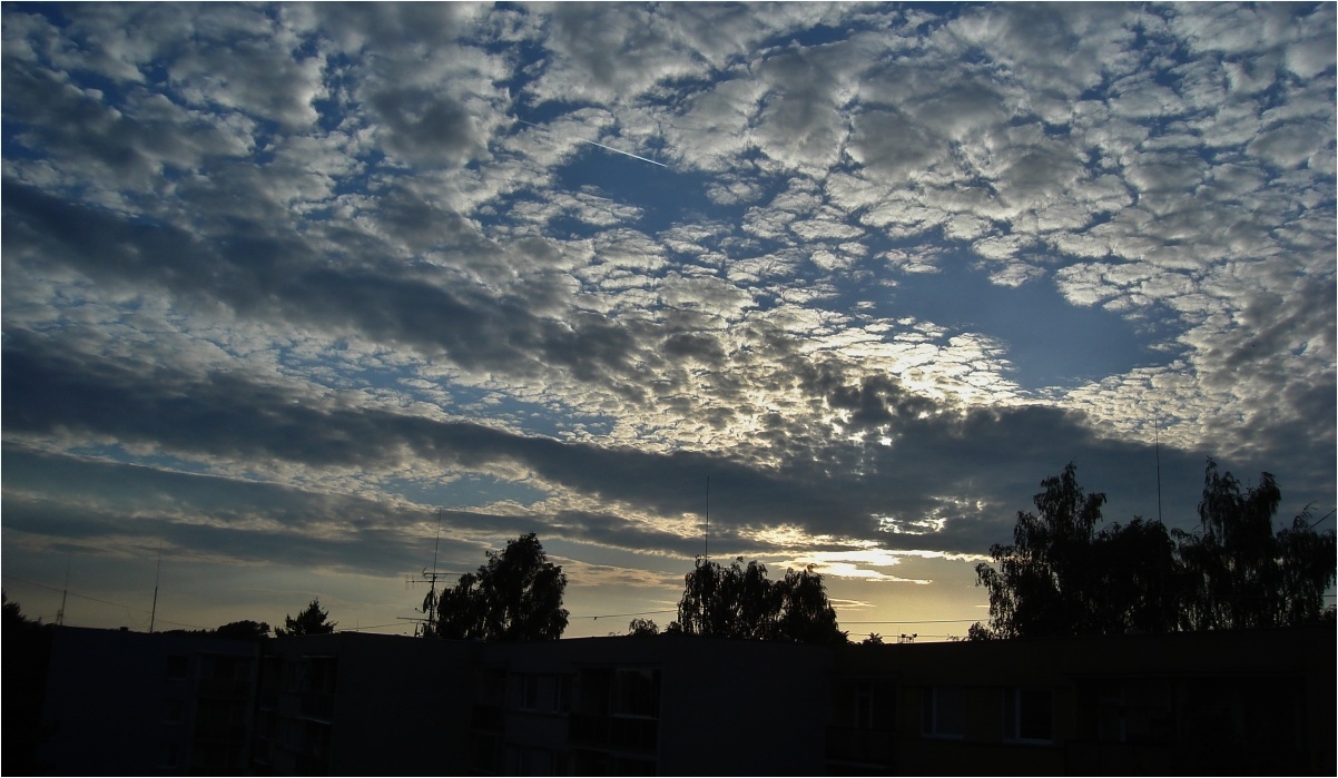 Včera jsem byl přetížen prací, kterou mi naplánovala manželka, dokončit bránu před garáži, pokosit čtrnáctidenní trávu na 2400 metrech. No hrůza to byla. Uhlovou bruskou jsem si prsty pobrousil, naštěstí mi zůstaly. No a odpoledne jsem pustil sekačku z ruky a začalo pršet nevím kdy skončilo, protože jsem se svalil do postele a otevřel oči když lezlo slunce. Mraky strašné tak jsem pokračoval ve spaní. Teď je obloha celkem čistá, ale všiml jsem si, že od západu táhnou mraky.