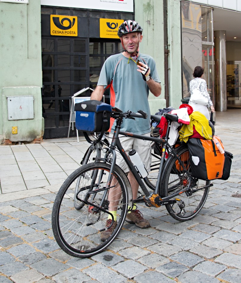 Zdar kucí šiškovní - Konečně se vedro omoudřilo a odplulo na Saharu ale pokles teplot na 15 stupnů je taky drsnej-že . Tak dám včerejší podmračno a dusno. Ve městě jsem potkal turístíky z englandu .Takového bicykla nemá ani Vladimír ;)