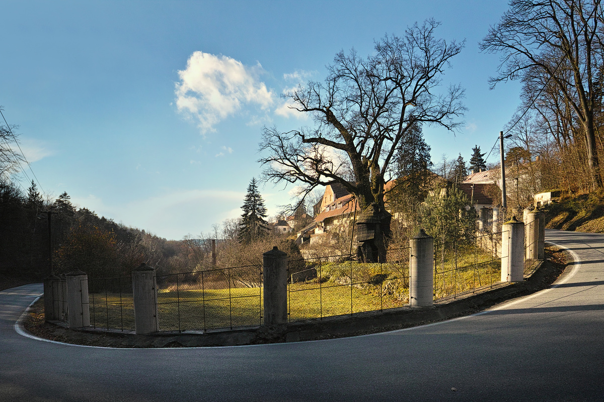 Pravděpodobně nejstarší dub v ČR. Fotí se poměrně špatně: Zavěšen na plotě, kde pár decimetrů od vás řežou zatáčku auta... Občas to některý náklaďák řízne trošku víc a je potom na pár dnů volnější výhled, než zase plot a sloupky opraví....