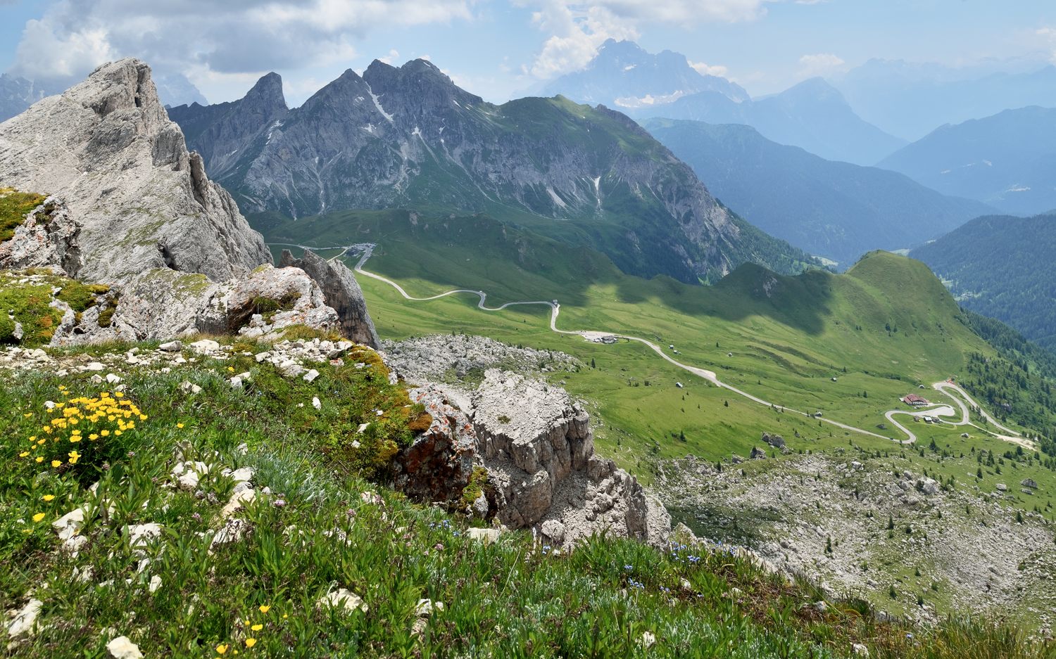 Ještě dva cvaky nad Cortinou, bohužel už polední slunce. Na prvním jsou všechny tři vrchy Tofana - Tofana di Rozes vpředu, za ní Tofana di Mezzo (3244 m.n.m.), kam vede i lanovka se kterou jsem tam vyjel a vzadu Tofana di Dentro: https://cs.wikipedia.org/wiki/Tofana. Na další fotce je detail horolezecké skupiny Cinque Torri.
