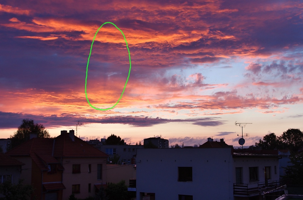 ten pruh byl evidentně na obloze nebo obecně v povětří, protože se držel na stejném místě v reálu i když jsem foťákem pootočil. ale všimnul jsem si toho až při prohlížení. připadá mě to jakoby tam někde byl nějaký zdroj třeba teplého vzduchu (nebo třeba ufo )