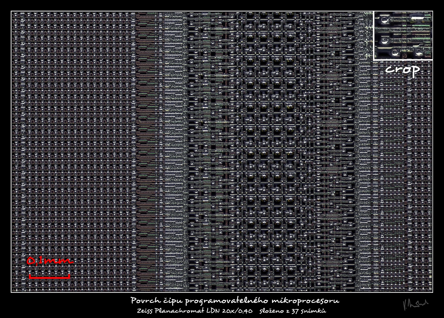 Povrch čipu procesoru, šířka záběru 1,11mm, složeno z 37 snímků.