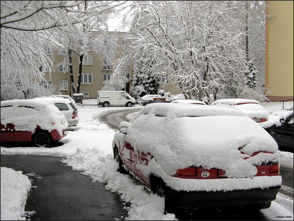 Z včerejší odpolední a noční sněhové nadílky dnes dopoledne před barákem ...