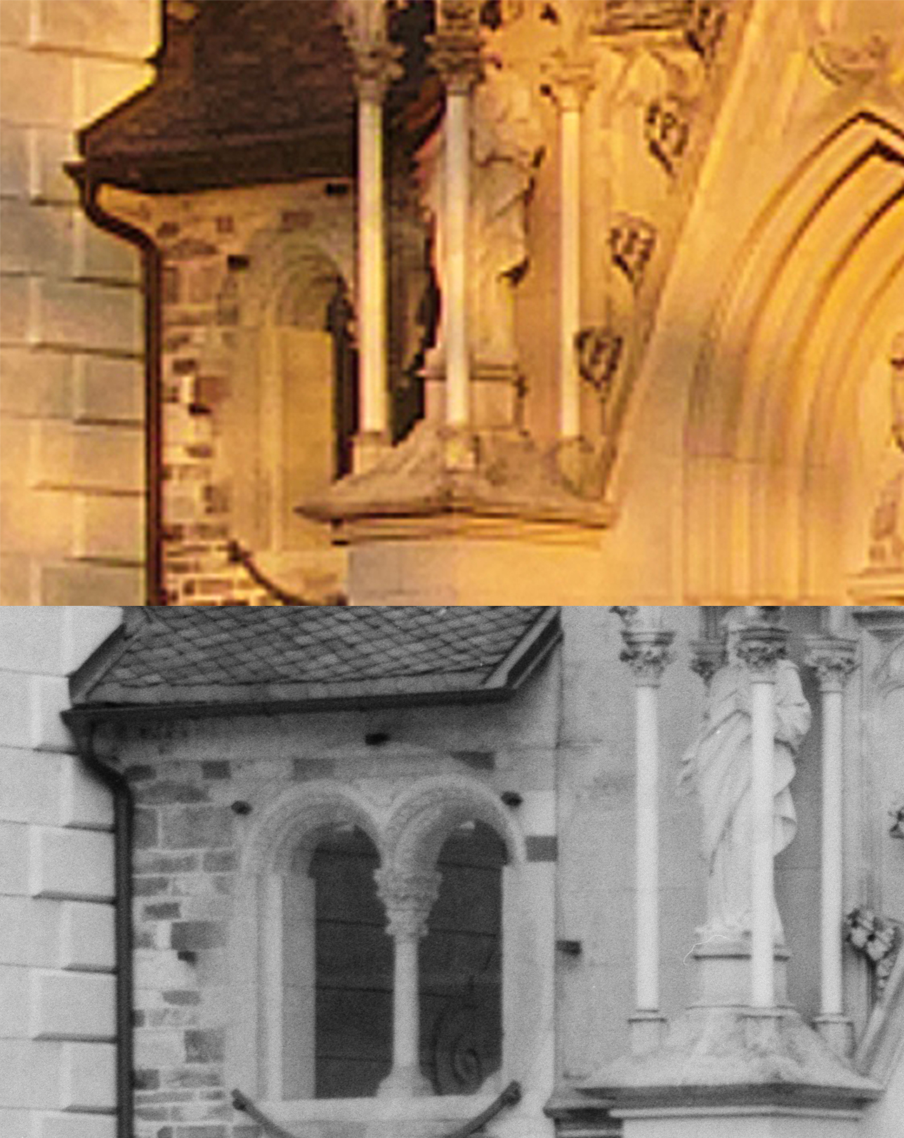 Josefe: Jarouš zvětšoval z původního snímku, kde byl kostel přibližně na polovině záběru, aby dosáhl svislých svislic. Ale i kdyby byl přes celý záběr (myšleno celý jeden záběr tak jako je z jednoho záběru ten sken), tak to s tou digitální verzí podle mě o moc lepší nebude. ;-)