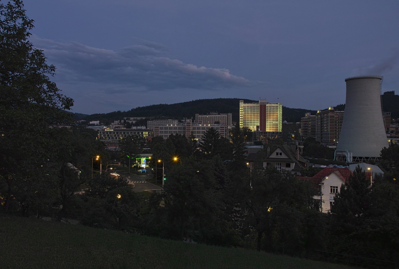 Pokračování v postupném vývoji. V devět hodin začali postupně nasvěcovat "jednadvacítku". Druhá fotka je o 18 minut později. Mám takový pocit, že "mrakoš" je nasvícený pouze během festivalového týdne, ale nejsem Zlíňák, takže nějaká výjimka během roku (např. Vánoce) možná existuje.