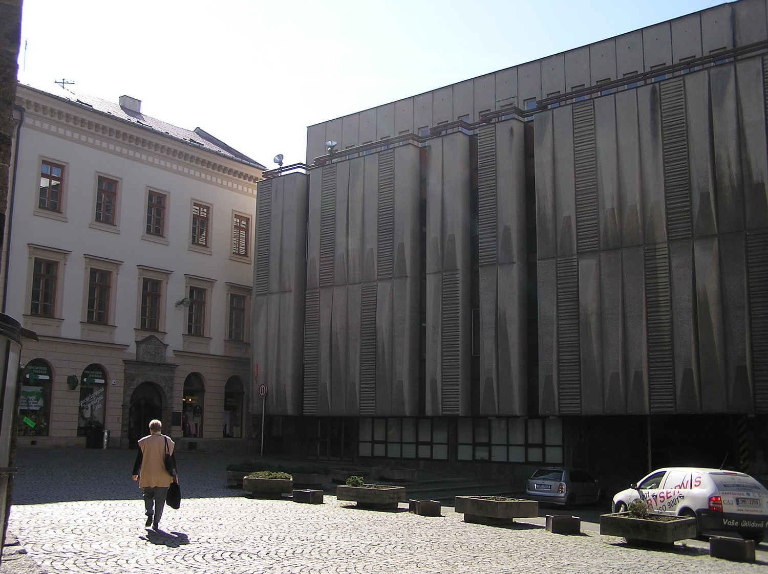 Vykachlíkovanej orloj jak koupelna s budovateli... a supermarket ve stísněném náměstíčku 2m před okny bytů renesančních budov a v těsné blízkosti gotického kostela a kašen a pod... :twisted: Starší foto z kompaktu:
