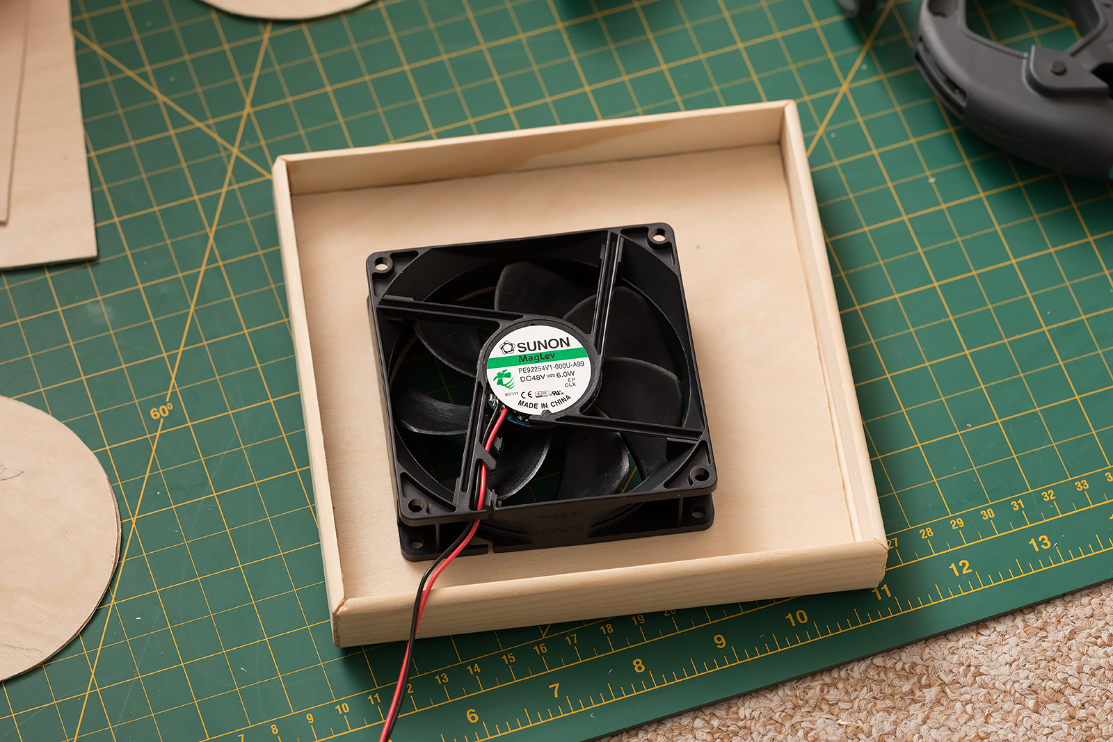 Jen sem Infutacem podlepil kousek uhlíkové tkaniny skelnou, aby se po vykrojení koleček nerozpadala a použiju takové sendvič posléze na dvě víčka. Takže ty budou bez překližky (tu mám jen jako šablonu) a sendvič, že se po prolepení pryskyřicí bude střídat skelná tkanina s uhlíkovou.