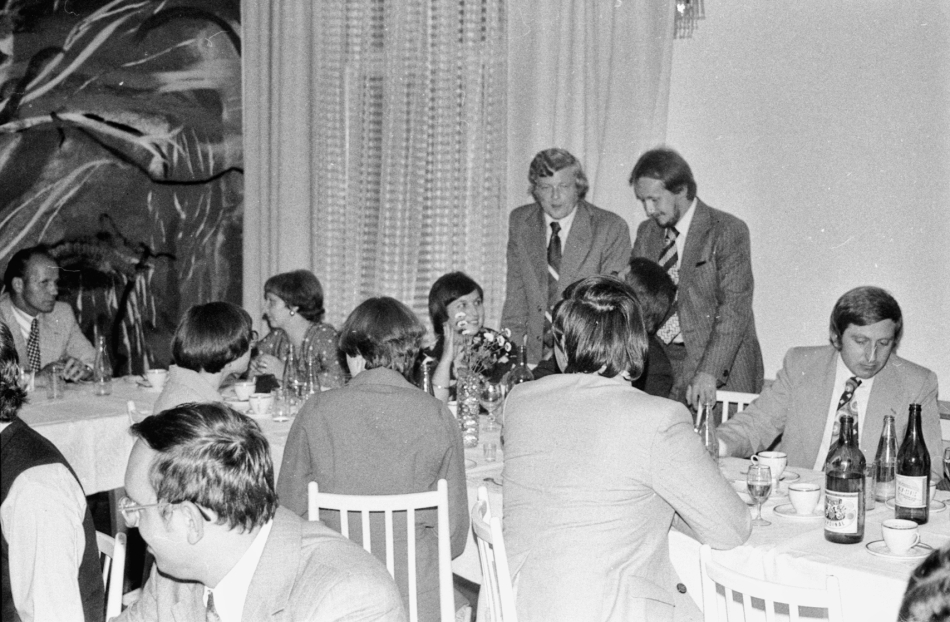 deset let po maturitě, v roce 1977. Na té první je náš tehdejší matikář, pak chemička a náš třídní - zeměpis